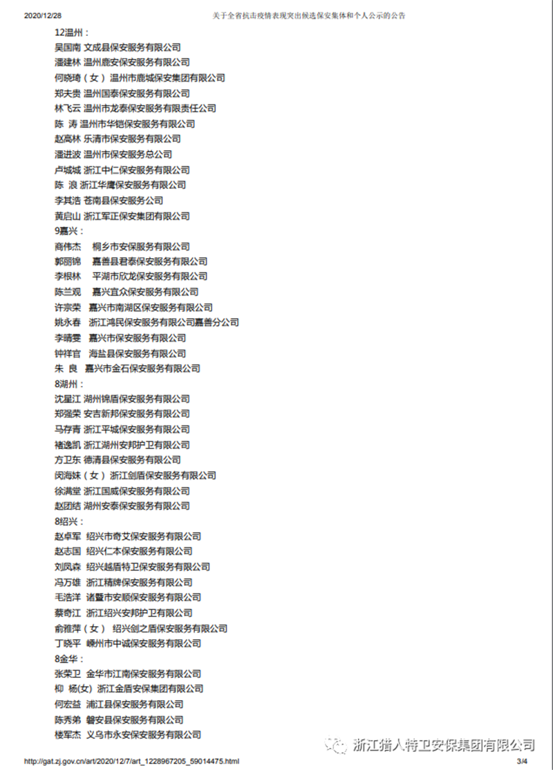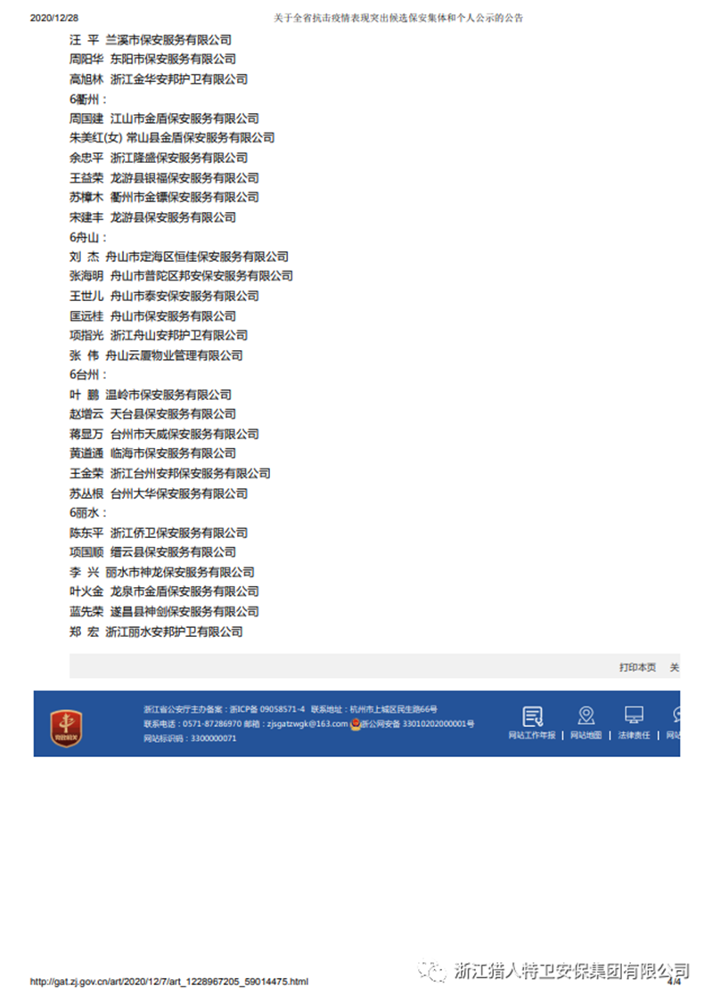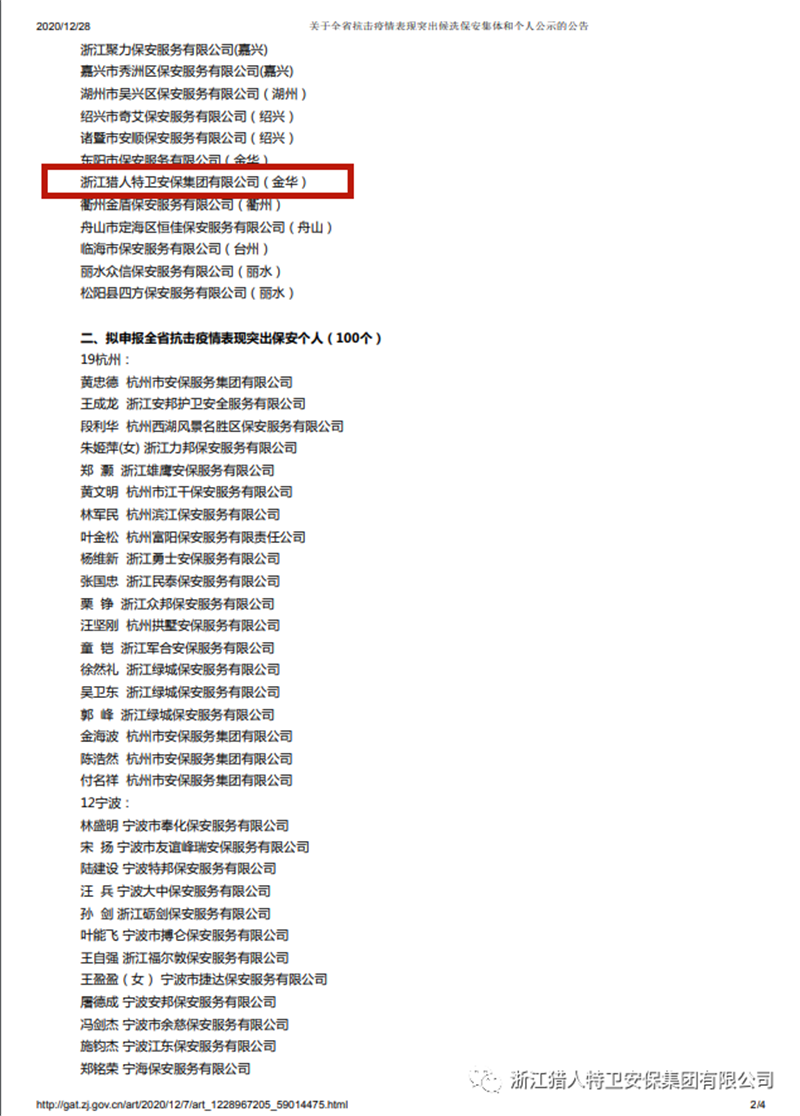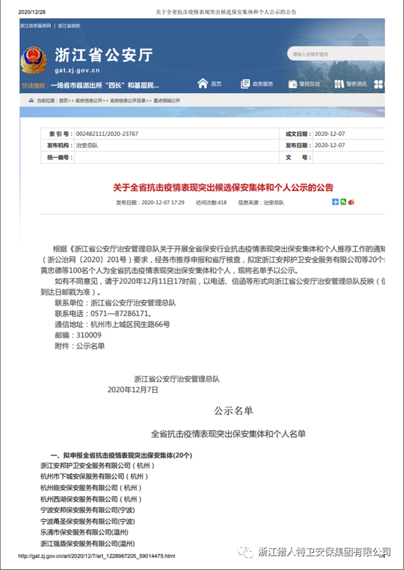 2020年12月14日,浙江省公安廳印發(fā)《浙江省公安廳關(guān)于對全省抗擊疫情表現(xiàn)突出保安集體和個人予以表揚的通報》,決定對全省保安行業(yè)抗擊疫情表現(xiàn)突出的20個集體和100名個人予以通報表揚。其中,浙江獵人特衛(wèi)安保集團有限公司被授予“全省抗擊疫情表現(xiàn)突出保安集體”榮譽稱號。