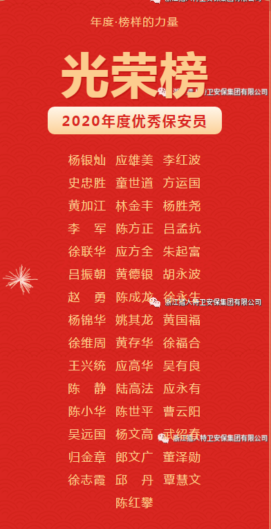 伴隨著新年的鐘聲,帶著難忘的記憶,我們走過了碩果盈枝的2020年,邁入了充滿希望、奮發(fā)進(jìn)取的2021年。時(shí)序更替,留下的是奮斗者的足跡。過去的一年我們風(fēng)雨同舟,公司涌現(xiàn)出了一大批主動(dòng)作為、敢于擔(dān)當(dāng)、表現(xiàn)突出的優(yōu)秀干部和員工,用真實(shí)的行動(dòng),詮釋著保安這份職業(yè)的責(zé)任與擔(dān)當(dāng),展現(xiàn)了新時(shí)代“獵人特衛(wèi)”人的風(fēng)采和力量。接下來,讓我們一起回顧2020年公司和員工取得的省、市級(jí)各項(xiàng)榮譽(yù)和公司表彰。