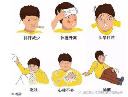 1、先兆中暑:出現(xiàn)大量出汗、口渴、頭昏、耳鳴、胸悶、心悸、惡心、體溫升高、全身無力。