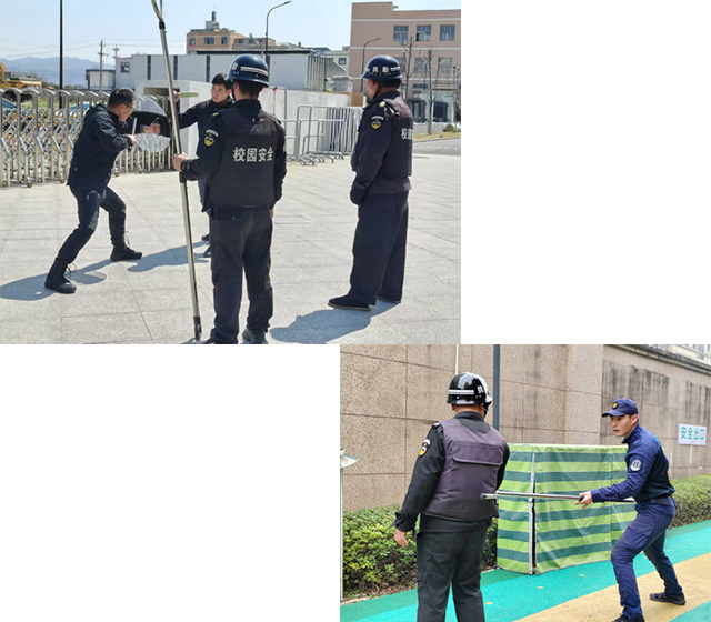 隨著演練指令的下達(dá),一場(chǎng)緊張而有序的反恐防暴行動(dòng)拉開序幕。模擬場(chǎng)景中,一名“不法分子”試圖闖入校園,校門口的保安人員迅速反應(yīng),按照既定預(yù)案啟動(dòng)警報(bào)系統(tǒng),同時(shí)利用盾牌、鋼叉等專業(yè)裝備有效阻止“不法分子”進(jìn)入。通過演練檢驗(yàn)校園安保能力,優(yōu)化應(yīng)急處置流程,確保突發(fā)事件“一分鐘反應(yīng)、三分鐘控制”。
