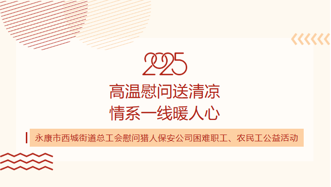 2025年9月19日,炎火夏日,驕陽似火,永康市西城街道總工會(huì)帶著滿滿的關(guān)懷走進(jìn)獵人保安公司,為奮戰(zhàn)在一線困難職工和農(nóng)民工送上米、乳膠涼席、肥皂生活物資,用實(shí)際行動(dòng)傳遞永康市西城街道總工會(huì)組織的溫暖與支持。