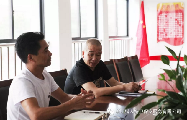 6月20日,磐安縣公安局治安大隊、教育局、財政局領(lǐng)導(dǎo)及磐安縣保安公司總經(jīng)理一行四人來到浙江獵人特衛(wèi)保安服務(wù)有限公司,就校園安保服務(wù)項目所涉及的保安員任職條件審定、保安員崗位安置、保安員隊伍管理、服務(wù)質(zhì)量管理、校園風(fēng)險評估預(yù)防、人防技防的優(yōu)勢互補(bǔ)及發(fā)揮、安保延伸服務(wù)等問題尋求答疑。