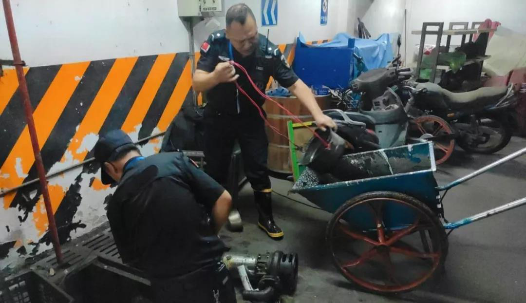 北苑小區(qū)多個(gè)地下車庫積水更加嚴(yán)重,“黨員先鋒隊(duì)”攜帶的一臺(tái)抽水泵根本就是“杯水車薪”,只好向其他小區(qū)緊急借用抽水泵……